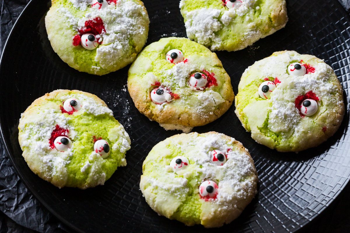 Ces cookies, issus d'une célèbre recette de biscuits craquelés, ont été customisés pour l'occasion. Agrémentés d'yeux en sucre et de quelques gouttes de colorant vert et rouge, ils sont prêts à hanter vos soirées d'Halloween. N'attendez pas pour les goûter !